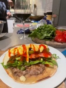 • Create a burger patty size and place on a lined baking tray. Spray with olive oil. Season with salt and pepper. Pop in the oven for 15 minutes until brown (you could alternatively cook the patties in the airfryer.