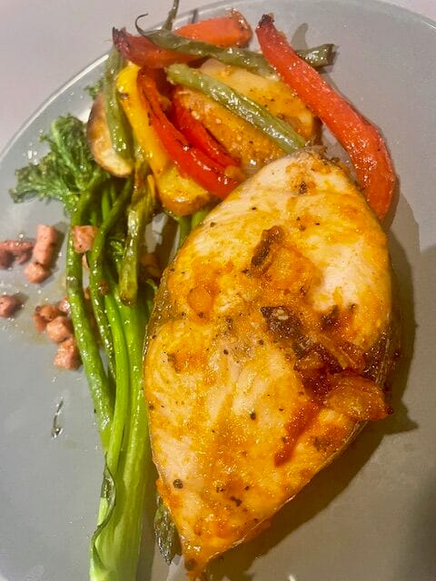 Once the fish is cooked through, remove from the oven and plate altogether with the baked veggies and greens. Server with a wedge of lime, fresh coriander and bowl of steamed jasmine rice.